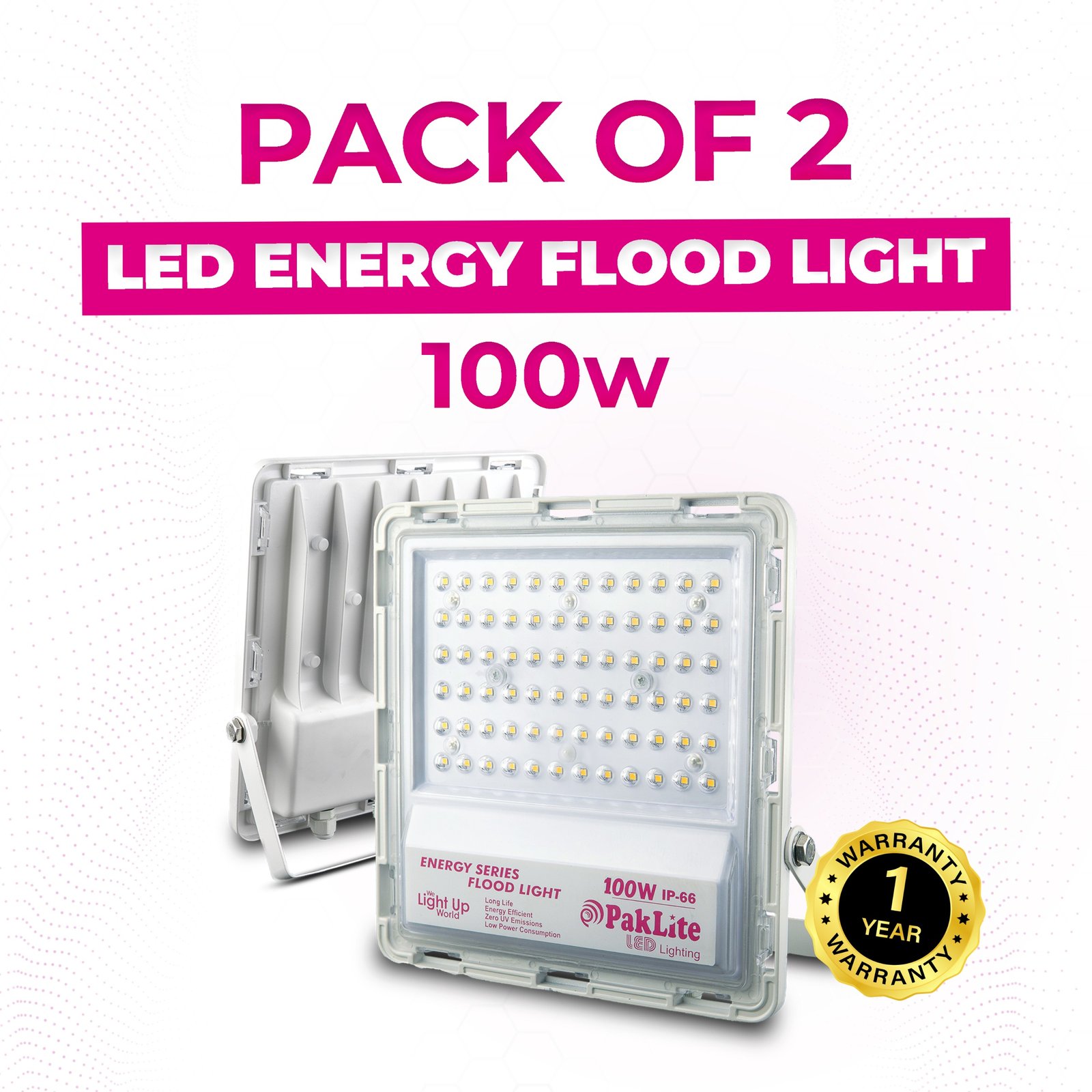 The Pack of 2 LED Energy Flood Lights 100W is a powerful lighting solution made for large outdoor areas that need strong and wide coverage. These high-performance flood lights deliver intense brightness. They are ideal for parking lots, open yards, warehouses, building fronts, sports areas, construction sites, and other spacious environments.